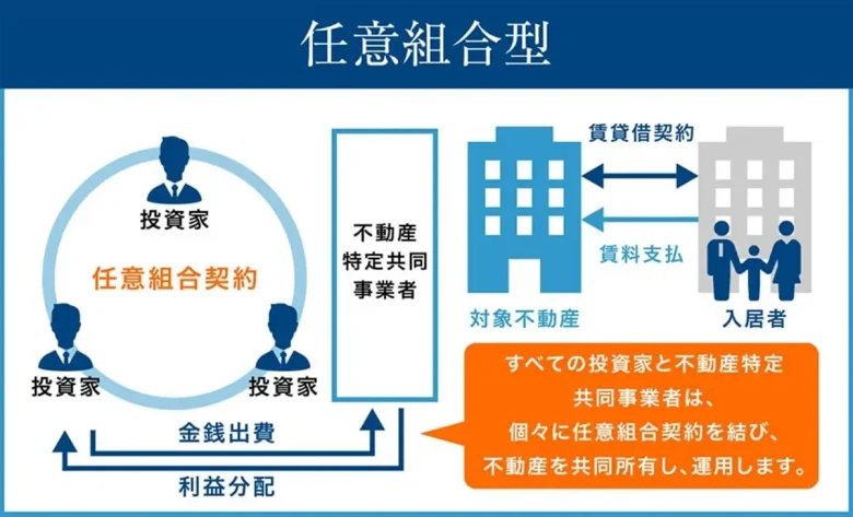 「任意組合型」は、不動産事業者とすべての投資家が1つの任意組合契約を結び、共同で事業を運営する形態です。