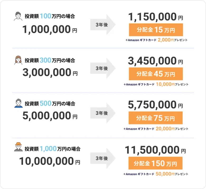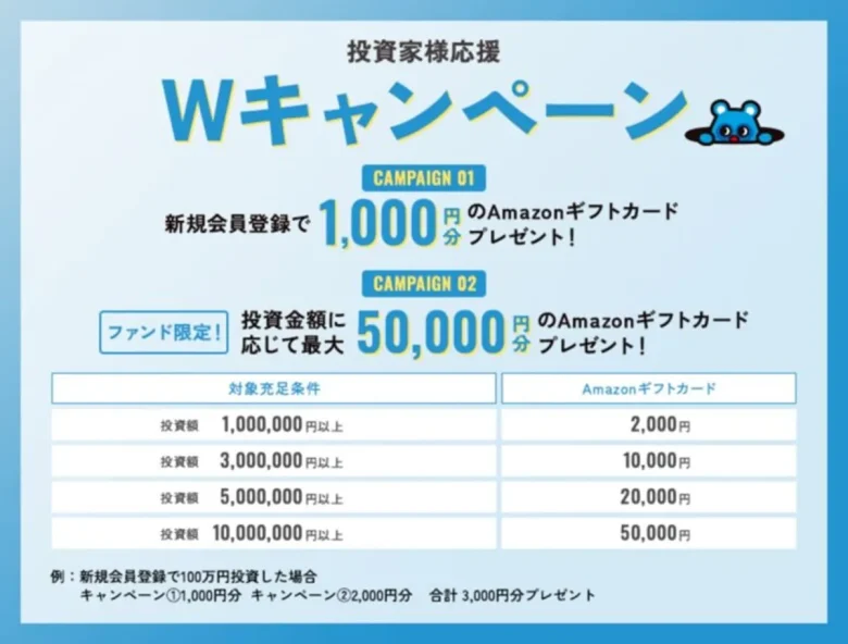 ① 本ファンド限定!投資額に応じて最大50,000円のAmazonギフトカードプレゼント