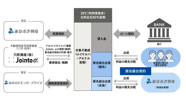 このファンドでは、特例事業者であるSPCが「ロイヤルパークホテル倉敷」を取得し、運営会社のあなぶきエンタープライズへ賃貸するスキームを採用しています。投資家への分配は、賃料収入と物件売却時の利益を原資とし、インカムゲインとキャピタルゲインの両方を得られる仕組みになっています。さらに、SPCを活用することで、運営会社の倒産リスクから投資家の資金を守る「倒産隔離」の仕組みを導入していることで、投資家の資金がより保全されやすくなっています。