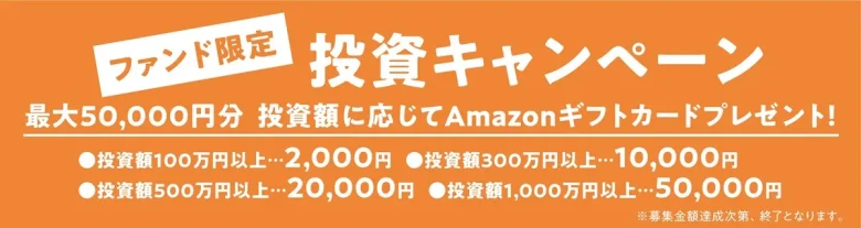 現在、投資金額に応じた特典キャンペーンに加え、新規で会員登録いただいた投資家様向けのキャンペーンもご用意しております。ぜひこの機会にご活用ください!