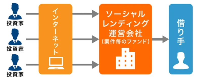 ソーシャルレンディングとは、「お金を借りたい企業(借り手)」と「お金を運用したい個人(貸し手)」を、インターネットを通じて結びつける融資仲介サービスです。「貸付型クラウドファンディング」とも呼ばれます。