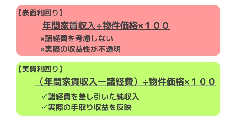 物件の収益性を判断するには、表面利回りではなく実質利回りで評価することが重要です。実質利回りは、年間家賃収入から諸経費を差し引いた純収入を物件価格で割って算出します。