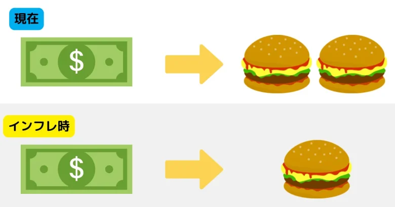 インフレとは、モノやサービスの価格が全体的に上昇する現象を指します。物価が上がると、同じ金額で買えるモノの量が減るため、お金の実質的な価値は下がります。