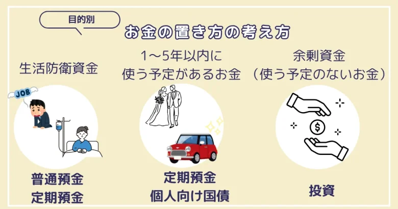 資産を効果的に管理するには、お金を目的別に分けて、それぞれに適した置き場所を選ぶことが重要です。すべてのお金を定期預金に預けるのも、すべてを投資に回すのも、どちらも適切ではありません。