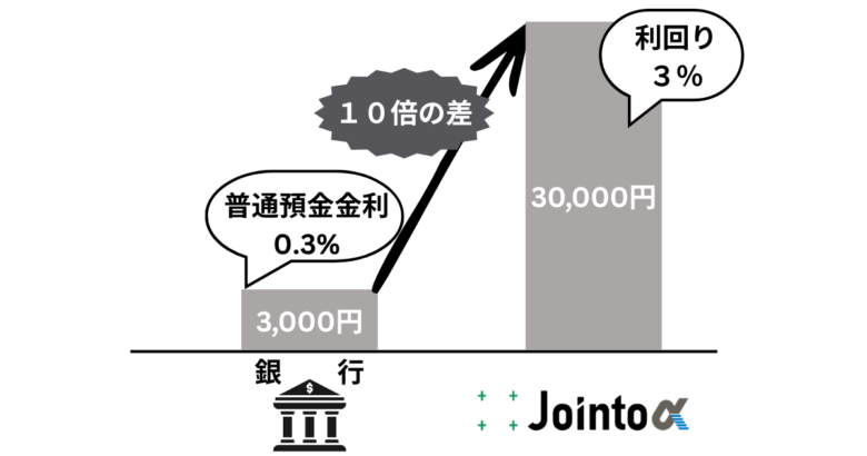 銀行は利息が3,000円、不動産クラウドファンディングは分配金が30,000円と10倍もの差があります。